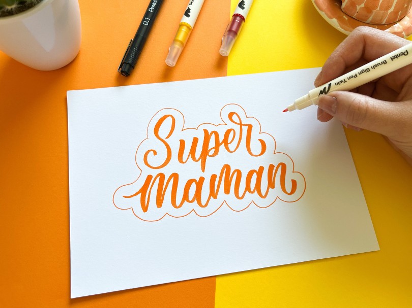 Écrivez votre message en brushlettering à l’aide de la grosse pointe feutre du Brush Sign Pen Twin orange.